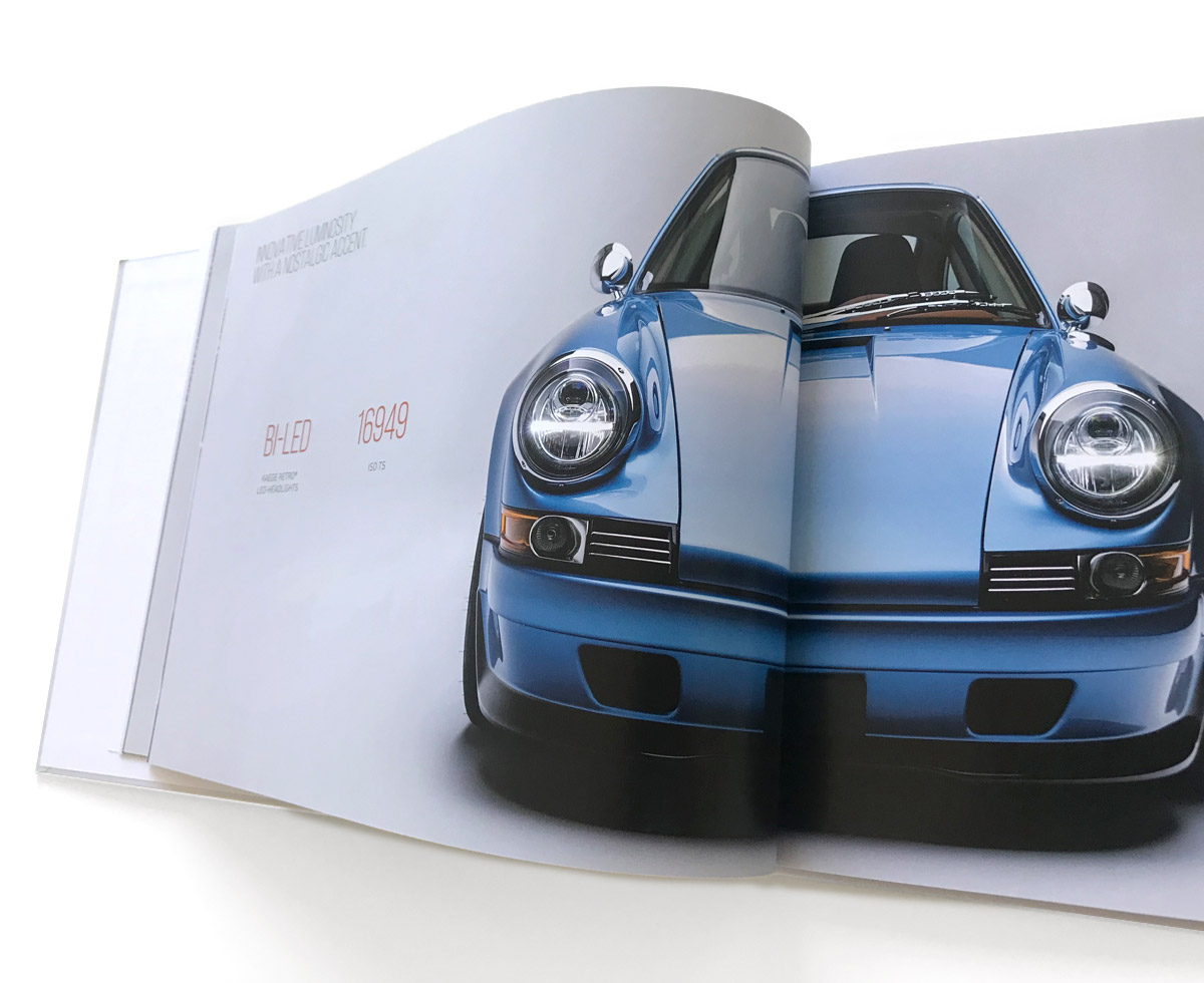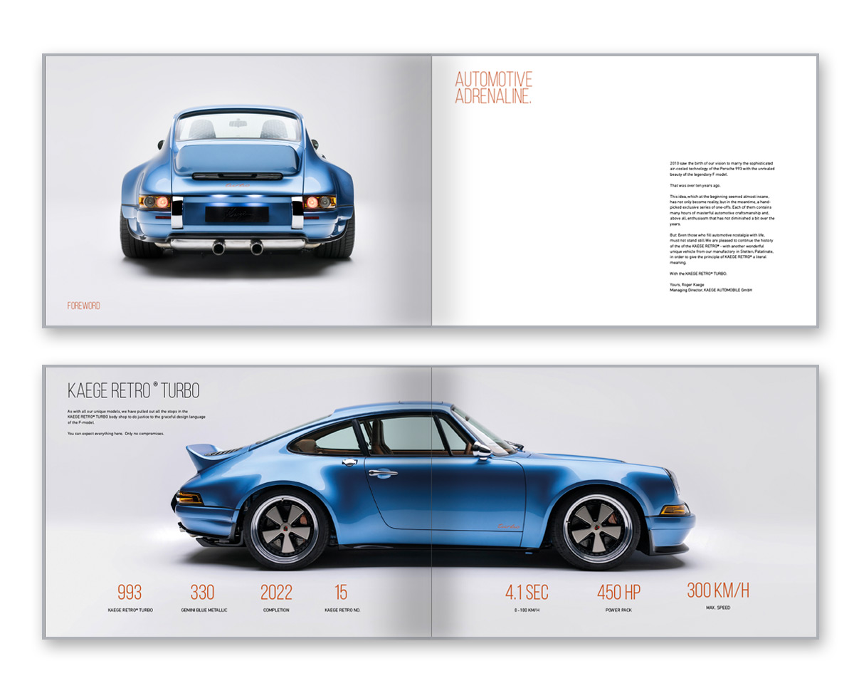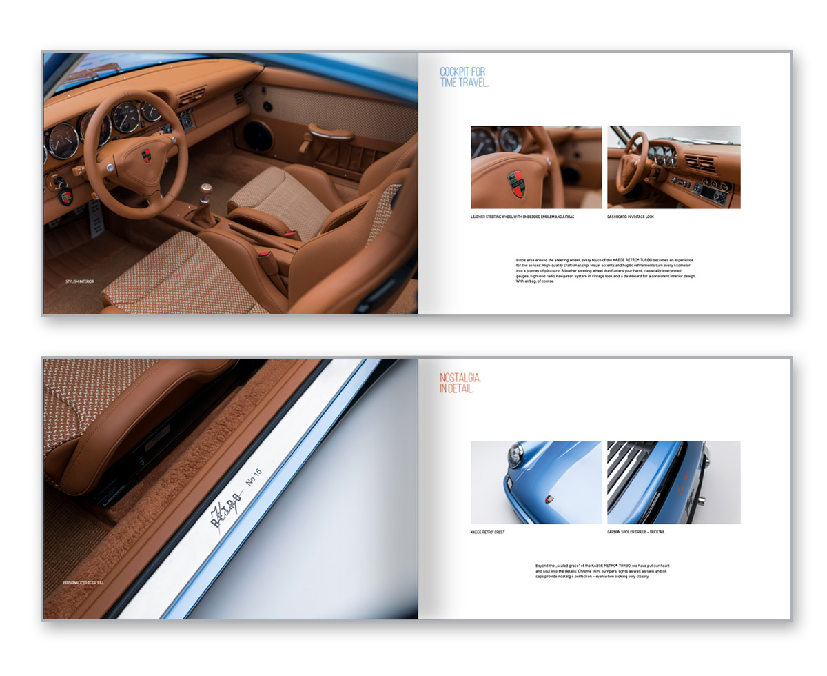 The book for the KAEGE RETRO® TURBO in the color Gemini blue metallic 330. A beautiful 56-page illustrated book in A4 landscape format, with lots of information and key data about our TURBO.
